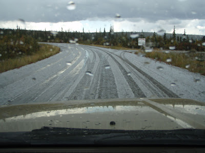 On the way back over the Top of the World Highway, a storm brewed up and it hailed so hard that the ground and highway were covered. The storm soon passed though, and we made it back to Dawson City safe and sound.