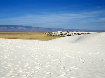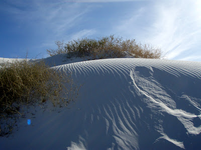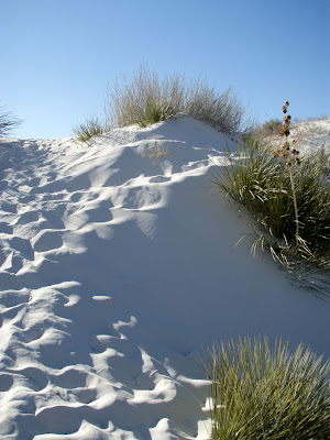 And yet, on the very edge of this military compound, lies an area of great natural beauty. We stopped in at the White Sands National Monument, which is full of (duh) white sand that's made of gypsum. Let me tell you, this sand is REALLY WHITE. I know it's a stupid thing to say, but it's striking. At one point the paved road ends and you're driving on packed down sand and sand drifts have been plowed away from the road, and it all looks like snow, only your windows are down and your feet are bare and still you're hot.