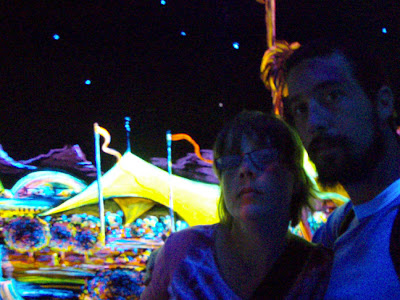 The thing about this town is, it's famous, but the thing it's famous for is not very tangible. So they have to just put up gift shops and themed eateries, but it's not like you can tour a UFO. So the attraction mainly consists of the gift shops, which is odd. One enterprising gift shop made a cheesy "black light immersive art experience", themed on UFOs of course. We went in it. Pure cheese, and twice as stinky. Mark has just asked me to say that he liked it. (nerd.)